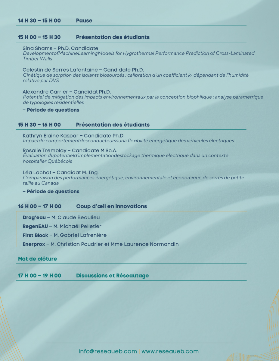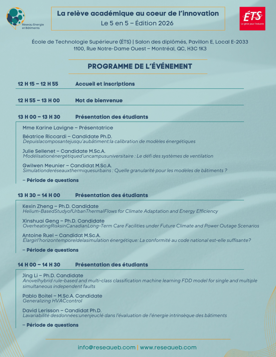 Le 5 en 5 de 2026 du Réseau Énergie et Bâtiments se tiendra le mardi 19 mai à l’ETS. Quinze étudiants de cinq universités (l’ETS, Polytechnique Montréal, l’Université Concordia, l’Université de Sherbrooke et l’Université Laval) nous présenteront en direct en 5 minutes et 5 diapos leurs travaux de recherche suivi de périodes de questions.